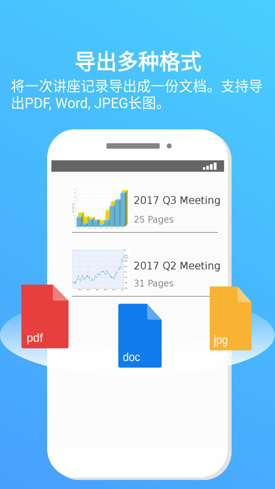 3、支持生成PDF, Word格式文档 将一次讲座所记录的投影和备注按顺序完整保存到一个文件里。
