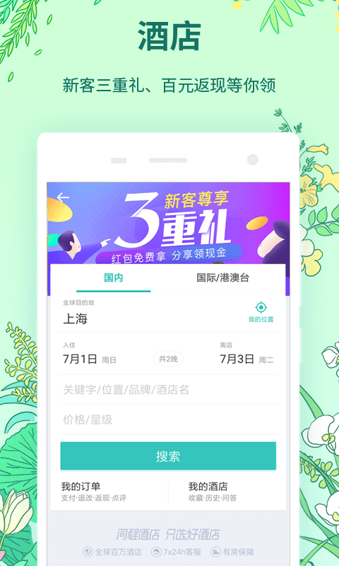 3、酒店:国内及港澳4万余家酒店预订,海量酒店房型照片以及真实住客的点评,入住发点评赢奖金,手机预订返得更多。