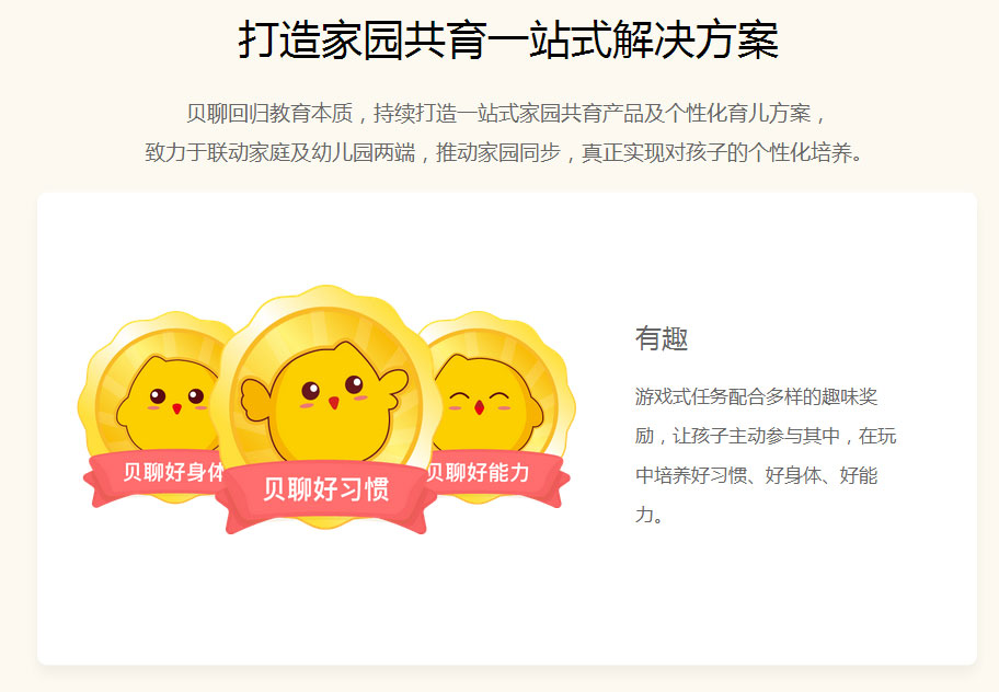 贝聊专注于3-6岁孩子的成长教育,倡导家园同步,以家园沟通、智慧考勤、智慧缴费等产品全面服务幼儿园及家长,不断强化家园间的联系,成为家园共育领域第一平台;同时,贝聊全面领跑幼教行业,整合优质教育资源,致力于打造家庭个性化育儿方案,真正满足用户对育儿的本质需求,培养亿万中国儿童好能力。