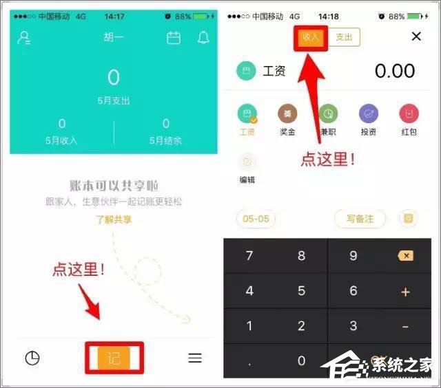 进入账本,下方点击“记”。 进入记账页,切换“收入”就好啦。