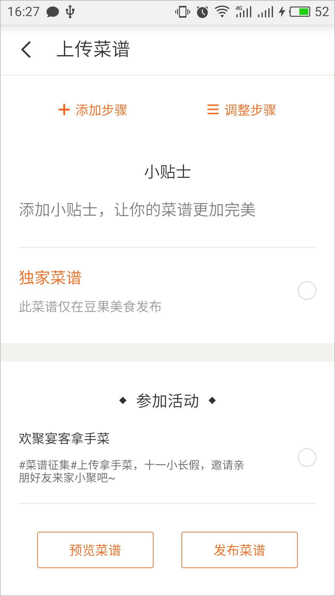 1、打开“豆果美食”客户端后,点击下方中间的“添加”按钮,选择“上传菜谱”;