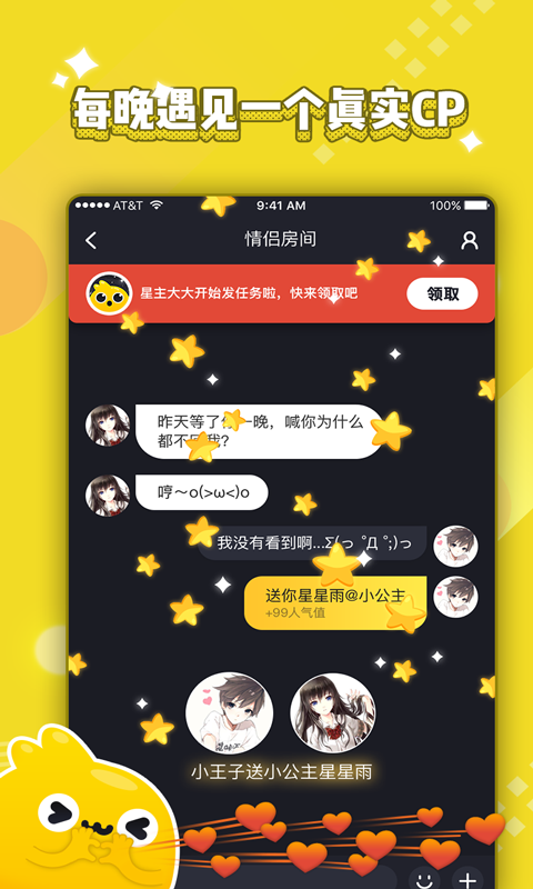 星主大大不仅是你们的红娘,特点各异的星主们还会在“舞会大厅”中组织各种有趣的多人游戏,你画我猜、爆照破冰、成语接龙、爆音唱歌、真心话大冒险。。.。只有你想不到,没有星主做不到的。