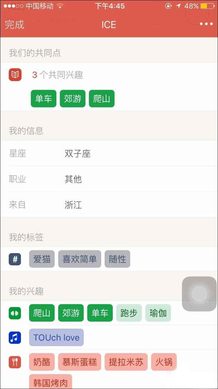 3、个人资料你可以在资料页存放六张照片,以及个人信息、标签、兴趣爱好以及趣味问答,增进别人对你的了解。