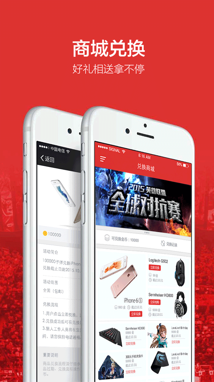 猎人竞技是一款以电竞游戏竞猜为核心的应用软件,可即时查看业界最新资讯、亦可投注英雄联盟、DOTA2、炉石传说等主流电竞游戏国内国外全部赛事。 金币商城罗列数十种实物、虚拟礼物等你来换,iPhone6S、机械键盘、充值卡应有尽有,参与猎人竞技才知道,原来iPhone6S可以不用买的!!