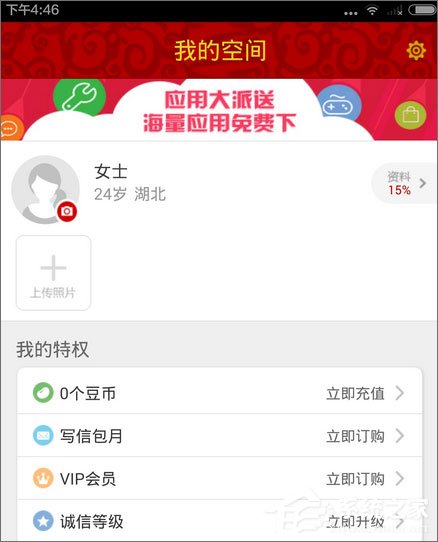 7、点击我,即可进行个人资料的一些输入,有相册,征友条件,会员,豆币等资源的设置。还可以设置头像。