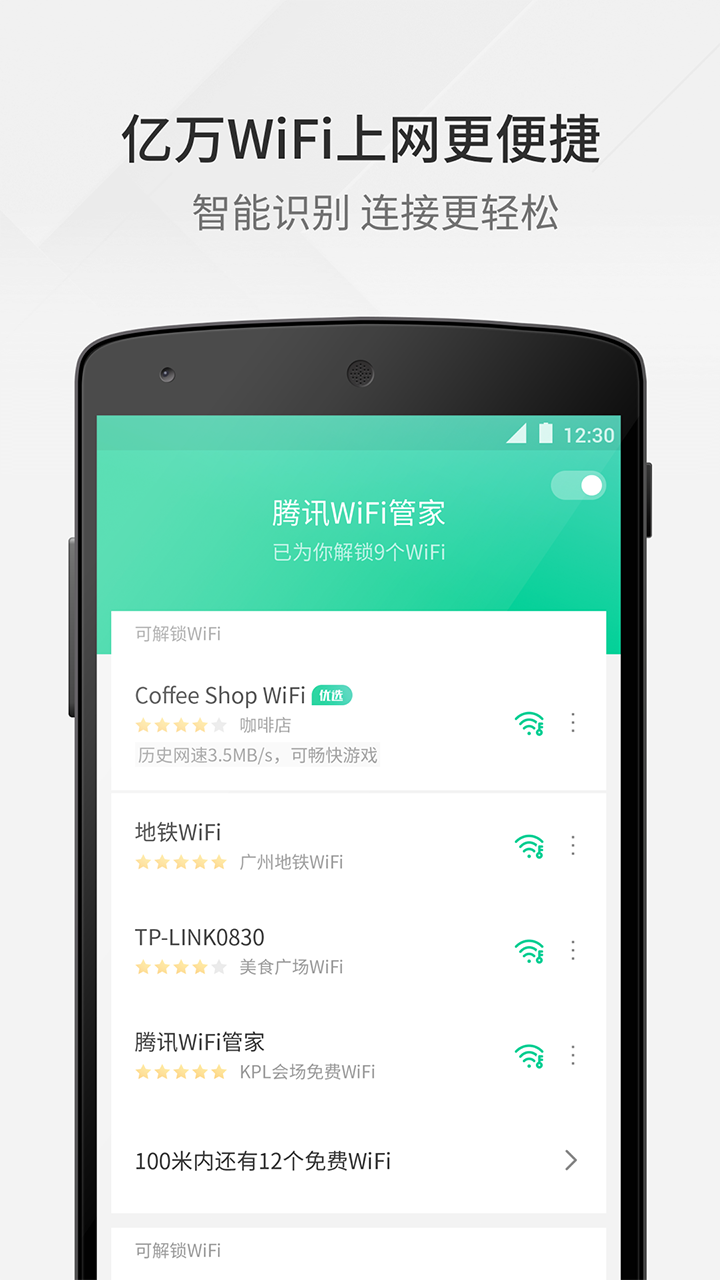 腾讯WiFi管家,亿万安全热点,无论走到哪里都能轻松连上好WiFi。腾讯游戏专属加速,告别网络卡顿,畅玩王者荣耀,助你超神五杀。