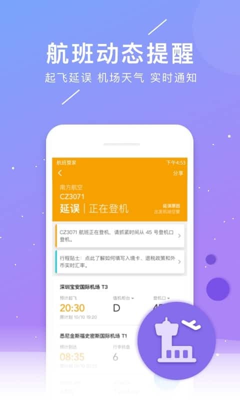 2、【航班动态实时掌控】航班动态订阅,及时获知航班延误、取消等状态信息,方便行程安排。
