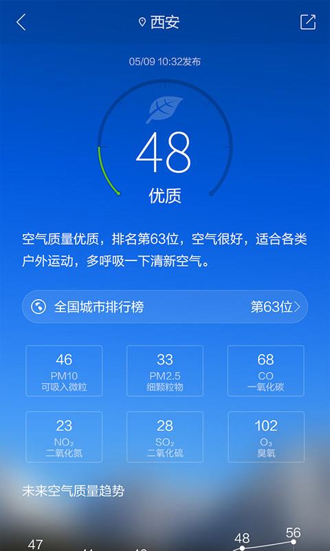 5、空气污染指数:小时级空气污染指数监测和全国空气质量排行榜,更有未来7天空气指数预测,关注空气质量,关爱你的健康;