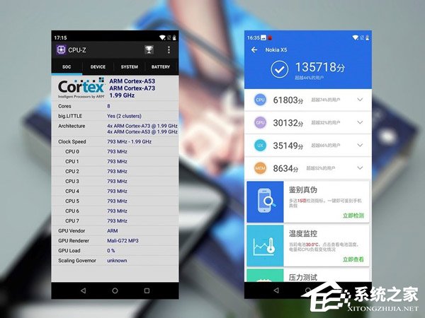 来看一下联发科P60性能表现,首先是跑分测试,在安兔兔平台,诺基亚X5跑分为135718分,其中CPU子项得分为61803分,表现较为强势,而GPU部分得分30132分,分数较为一般。总的来看在千元机价位上联发科P60是个非常好的选择。