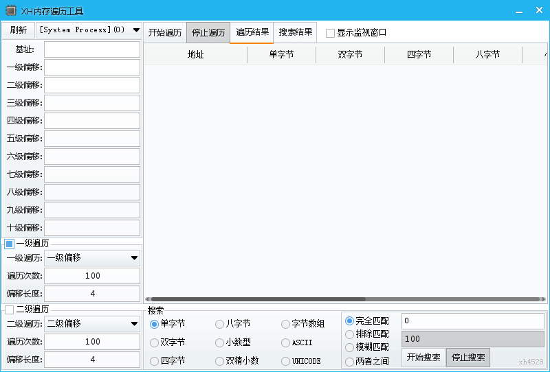 XH内存遍历工具是一款功能强大的内存遍历软件,通过基址与偏移的结合来查看内存中的数据,最大支持10级偏移。通过大量遍历后还可以过滤想要的数据,支持基址、偏移、循环次数、递增、搜索内容的保存,下次不用手动输入。它会对同一遍历结果进行多次过滤,去增加内存的安全性与实用性。