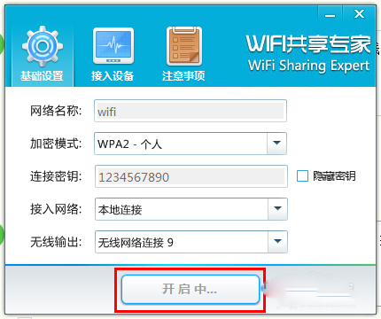 7.待WiFi共享专家激活完成后,点击“开启”按钮就可以正式进行无线热点创建过程。