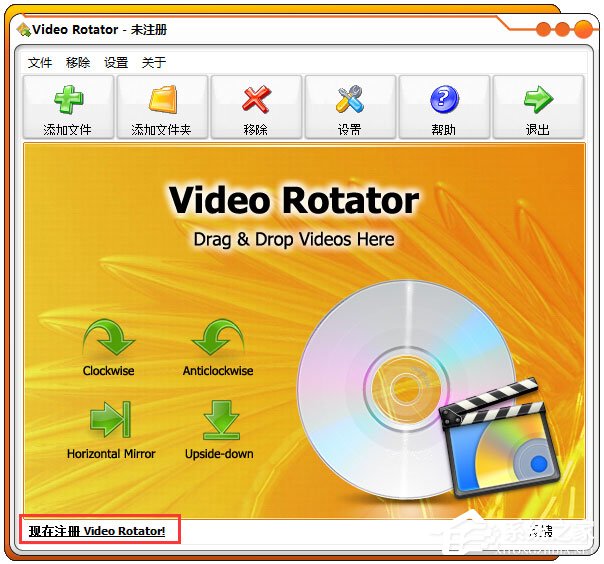 1、解压缩包运行软件,看到软件显示未注册后,在界面左下角点击“现在注册Video Rotator”;