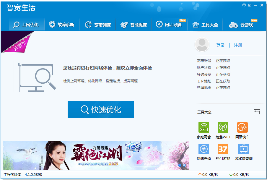 智宽生活电脑版是电信公司出品的一款辅助上网的一款宽带助手,能够有效的做到简单的网络优化、故障排除、测速提速等一系列工能的工具。智宽生活电脑版不仅提供宽带优化更提供其他的生活服务,有效的帮助用户解决基本问题。