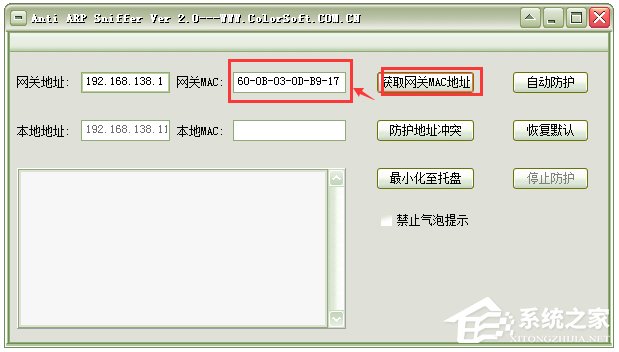 1、填入网关IP地址,点击[获取网关地址]将会显示出网关的MAC地址。点击[自动防护]即可保护当前网卡与该网关的通信不会被第三方监听。