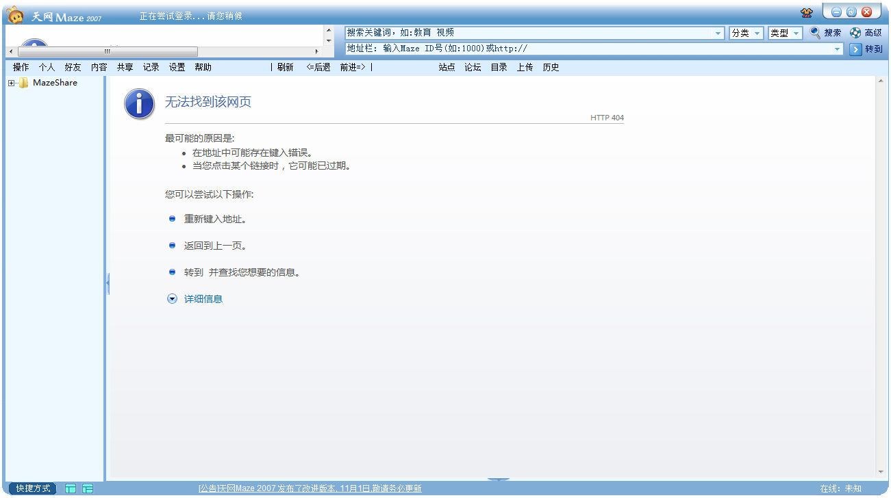 天网Maze2007是一款功能强大、使用简单的个人文件分享系统,资源丰富,以诚信交流为原则,和P2P有区别。本站提供天网Maze2007免费下载。