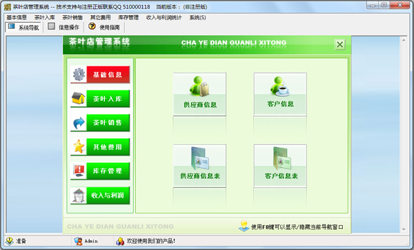 茶叶店管理系统是一款专为茶叶店设计的管理软件。本软件的功能非常强大,包括基础信息、茶叶入库、茶叶销售、其它费用、库存管理、收入与利润几大功能模块,大大提高了用户的工作效率。