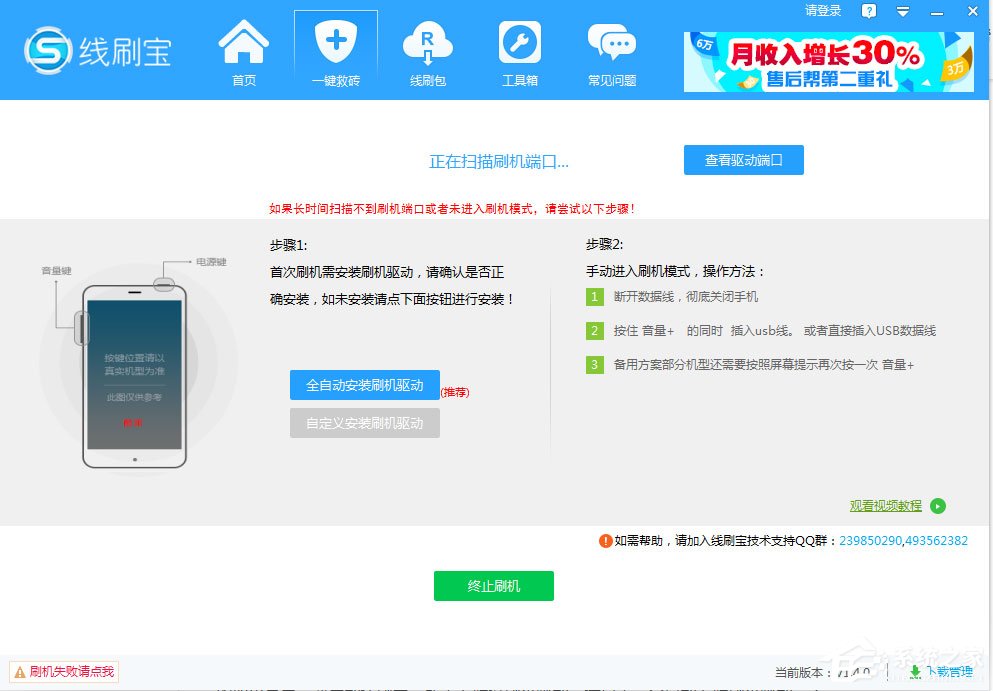 8、安装驱动后,如长时间仍扫描不到端口,可按界面操作指引手动进入刷机模式;