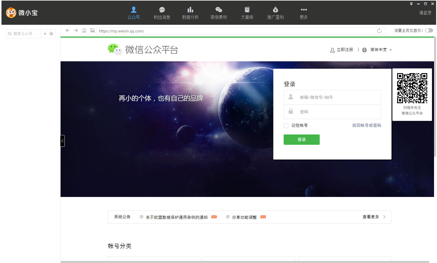 1、支持多帐号轻松管理:同时管理多个公众号,高效便捷让用户轻松掌握千万粉丝。
