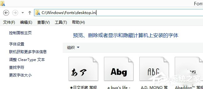2.第二步,检查有没有C:WINDOWSFontsdesktop.ini文件,desktop.ini直接在fonts文件夹因为隐藏可能查不到,还的设置显示查看所有隐藏文件,小编这里介绍个简单的方法:直接在我的电脑地址栏输入文件路径C:WINDOWSFontsdesktop.ini弹出文件来了,就说明存在,没有就是不存在。