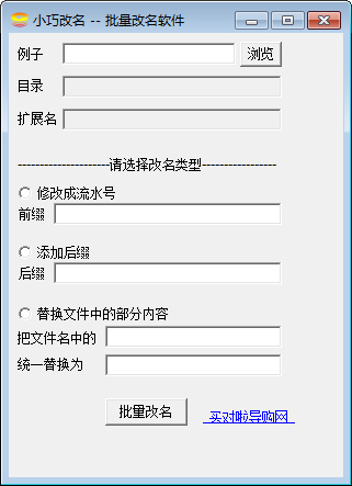 小巧批量改名软件是一款最精简最方便使用的批量改名软件,只要任意选择其中一个要改名的文件,再选择改名方式,软件就会立即把相同文件夹下的相同类型的文件都按照指定方式立即改名完毕。