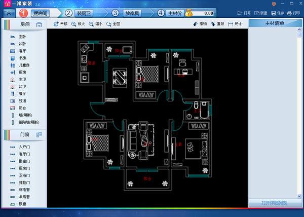 2.三步操作:摆房间、装厨卫、放家具,即可完成家装的主材及价格明细单、以及户型设计和家居摆设方案;