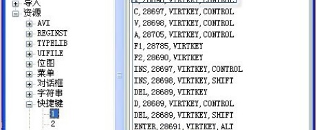 4、接着我们可以看到右侧的“C,28697,VIRTKEY,CONTROL”和“V,28698,VIRTKEY,CONTROL”,其中最后的“CONTROL”表示的是先按的键,最前面“C/V”是后按的键,我们只需要将它根据自己的需要进行更改就可以了。